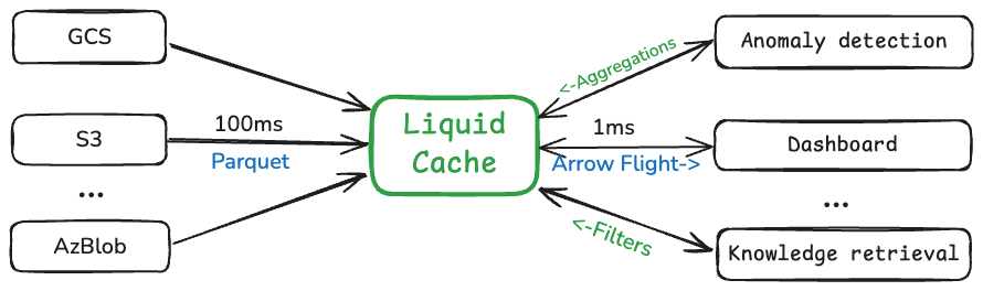 - At a glance, LiquidCache is a distributed caching service: it supports all object storage backends (S3, GCS, Azure Blob Storage, etc.), and serves all kinds of applications (knowledge bases, dashboards, etc.) deployed on all kinds of compute (Kubernetes, Lambda, etc.).